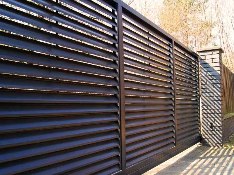 Забор-жалюзи отлично пропускает воздух и солнечный свет: в этом отношении его свойства аналогичны металлическому штакетнику.
